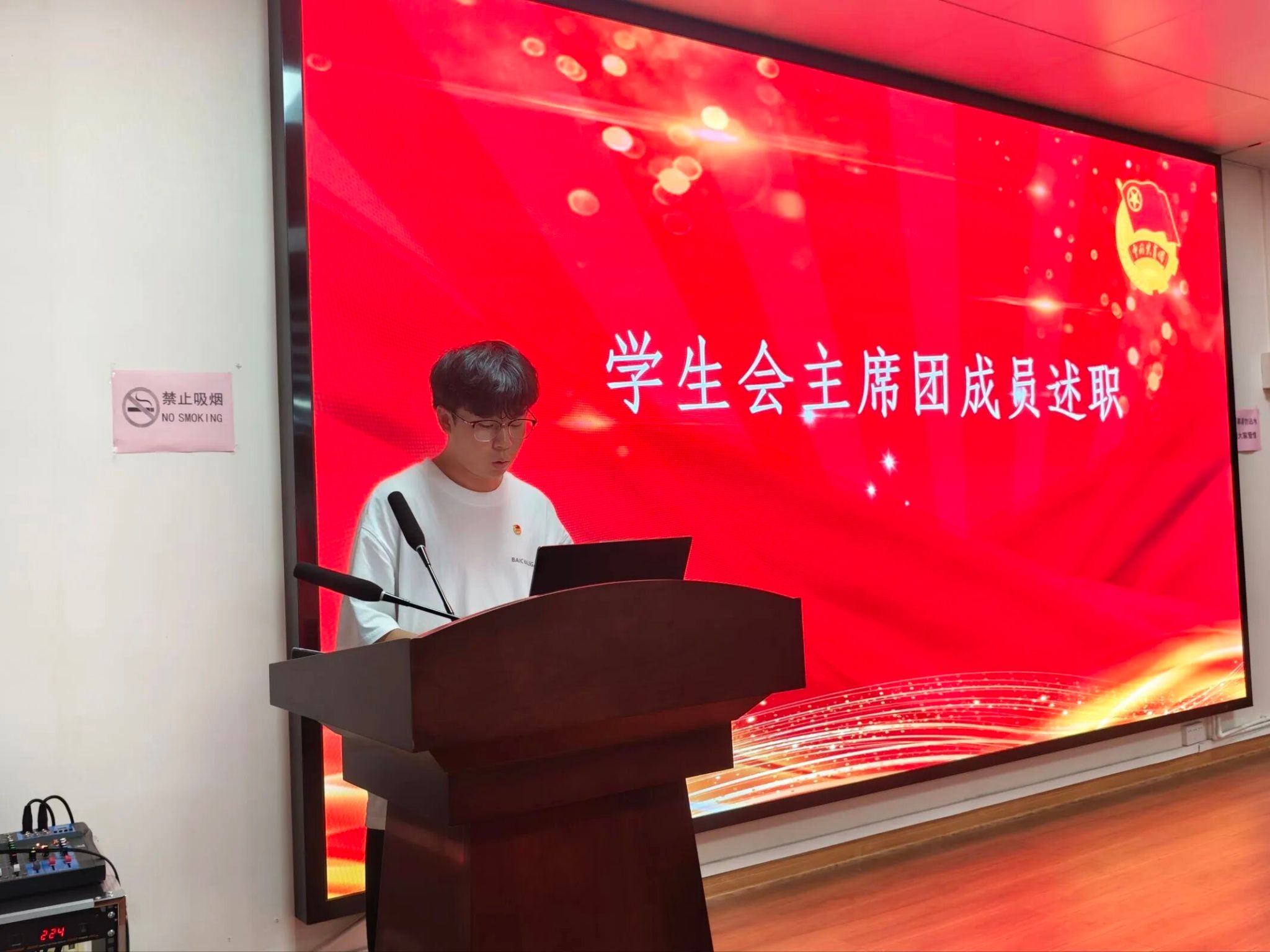 大会最后,团委负责人张妍老师作总结讲话。她首先衷心感谢第九届团学青全体员工干部的辛勤付出与贡献;高度肯定了过去一年中各项工作取得的成效与突破,赞扬了同学们在服务师生、自我成长中展现出的责任感与创造力;最后,她希望新一届团学青骨干能够继承优良传统,锐意进取、团结协作,持续推动组织发展,更好地服务于全院师生!