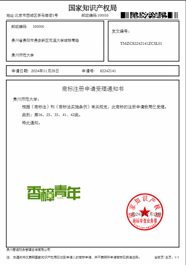 目前,“香樟青年”商标已正式在国家知识产权局注册。