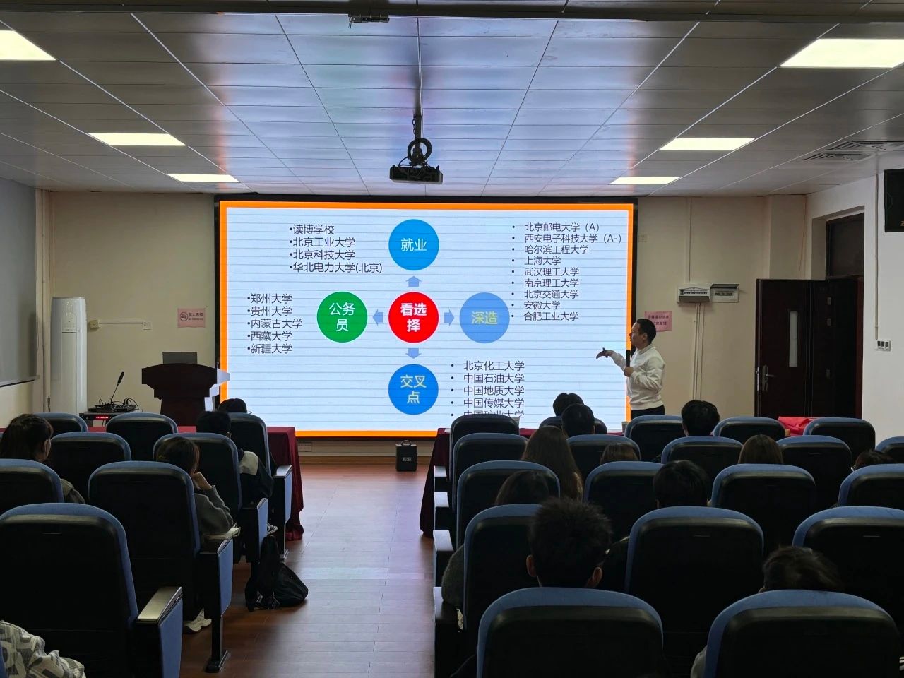 在报考院校选择这一关键环节,刘博士给出了极具针对性的建议。他提醒同学们,择校时需全面审视自身实际情况,将院校综合实力、特色研究方向、地域发展资源与个人长远职业规划等多重因素纳入考量,理性决策、避免盲目跟风。此外,刘博士还通过剖析不同层次院校的办学特色与竞争优势,为同学们搭建了科学的择校分析框架,助力大家精准定位理想院校。