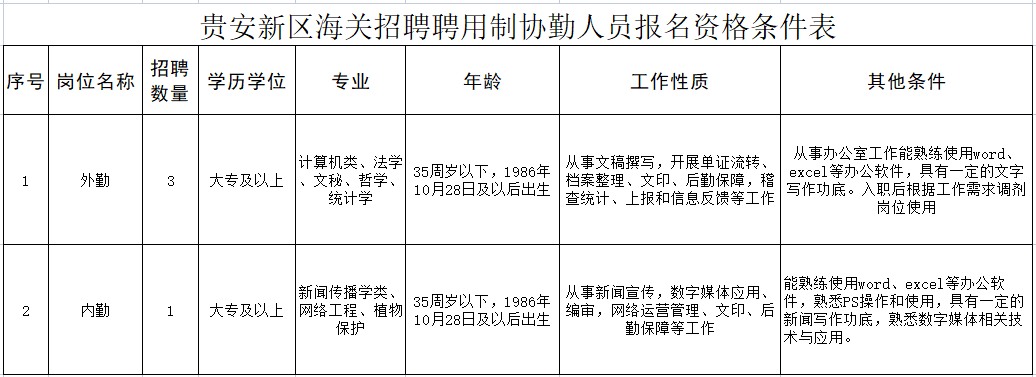 贵安新区海关因工作需要,现面向社会公开招聘编制外聘用制协勤人员4名。