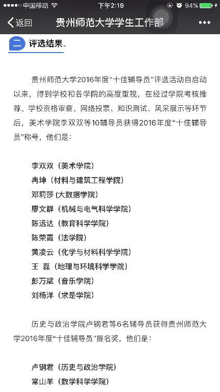 mksport体育2016年度“十佳辅导员”评选活动自启动以来,得到学校和各学院的高度重视,在经过学院考核推荐、学校资格审查、网络投票、知识测试、风采展示等环节后,公司辅导员邓莉莎老师重重闯关,最终以总分排名第三的成绩获得校“十佳辅导员”称号,为学院争得荣誉。