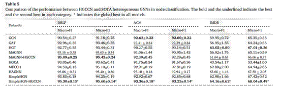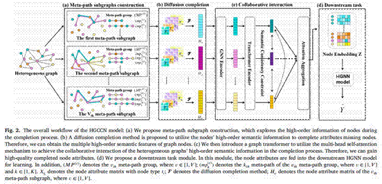 针对上述问题,本研究提出了一种用于属性缺失异构图表征学习的异构图补全协作网络(简称为HGCCN)。该网络首先利用高阶扩散补全方法补全缺失属性,然后引入具有多头自注意力机制的图变换器,自适应地在多个已补全语义属性之间进行异构图信息的协作交互。 具体来说,首先构建多个元路径子图,在补全过程中探索节点的高阶语义信息;其次提出一种新颖的扩散补全方法,利用探索到的高阶语义信息更有效地实现高阶扩散,补全缺失属性;接着引入图变换器实现异构图的高阶语义信息的协作交互,进一步获得增强的节点补全属性,最后将节点补全属性输入到下游的异构图神经网络进行下游任务的表征学习。综上所述,与现有方法相比,HGCCN的优势在于能够利用来自不同元路径子图的高阶语义信息与所提出的扩散补全方法实现高阶扩散补全,并通过异构图的协同交互增强节点补全属性。HGCCN在节点分类任务上进行评估,并在三个基准数据集上进行了大量的实验,证明了其在实际应用中有效性和可靠性。