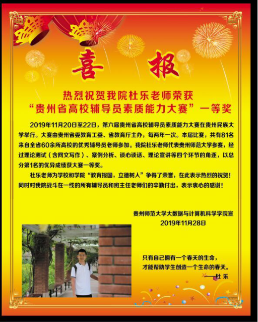 热烈祝贺公司杜乐老师荣获第六届“贵州省高校辅导员素质能力大赛”一等奖